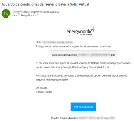 Once you decide to contract the virtual battery, you will receive an email like the one shown in the image with the contract, which can be signed by biometric digital signature.